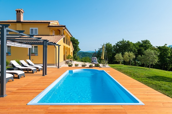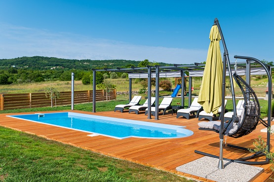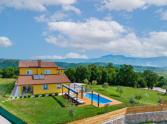 The Villa Klesari is new home for 8 people, was built in 2018 and is located in a small village called Klesari, 4 km from Potpićan where there are pharmacies, bakeries and shops. The nearest beach is 13 km away, town Pazin is 13km and lovely town Labin is 25 km away. The house has an amazing view over mountain Učka and the indigenous Pićan town. In its own garden of 2500m2 there is a swimming pool, deck chairs, a barbecue, a covered terrace, a swing for children and 3 parking spaces.